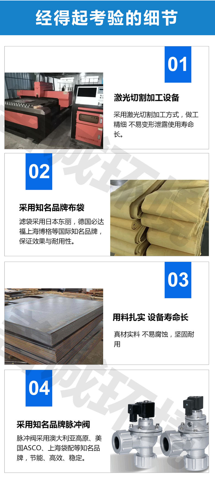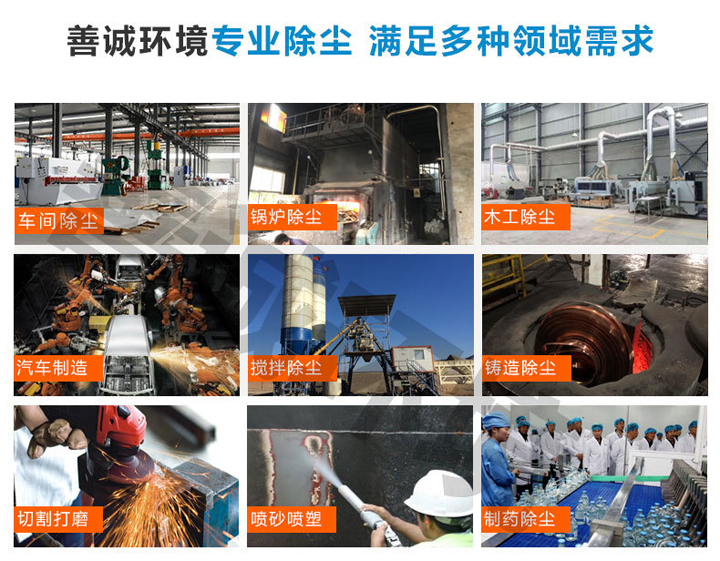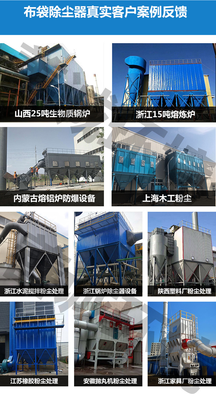 布袋除塵器主要處理生物質鍋爐煙塵、顏料粉塵、碳黑粉塵、下料混料揚塵、攪拌揚塵、石灰窯粉塵、中頻電爐煙塵、石墨粉塵、造紙廠、磚廠、食品廠、色母粒廠、水泥廠、面粉廠、橡膠廠、木工廠等一系列工況粉塵。