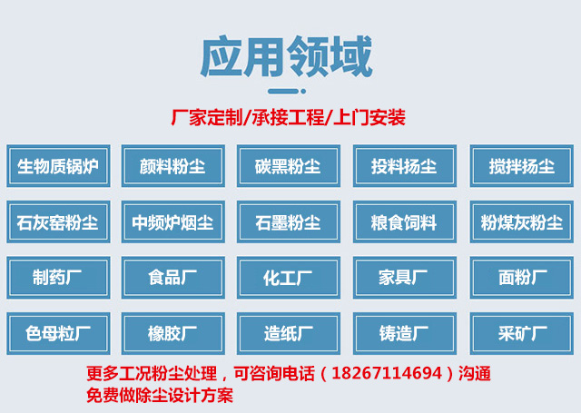 布袋除塵設(shè)備主要處理生物質(zhì)鍋爐煙塵、顏料粉塵、碳黑粉塵、下料混料揚塵、攪拌揚塵、石灰窯粉塵、中頻電爐煙塵、石墨粉塵、造紙廠、磚廠、食品廠、色母粒廠、水泥廠、面粉廠、橡膠廠、木工廠等一系列工況粉塵。