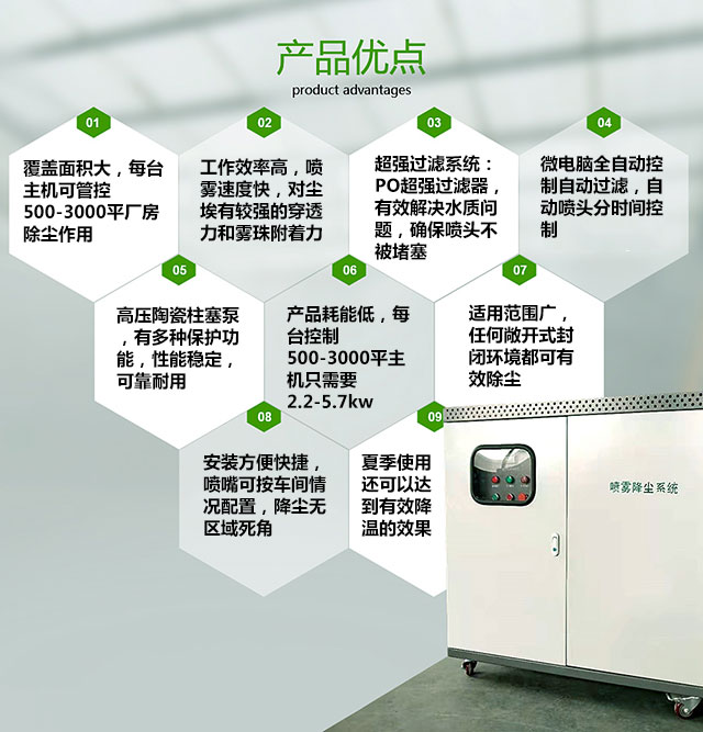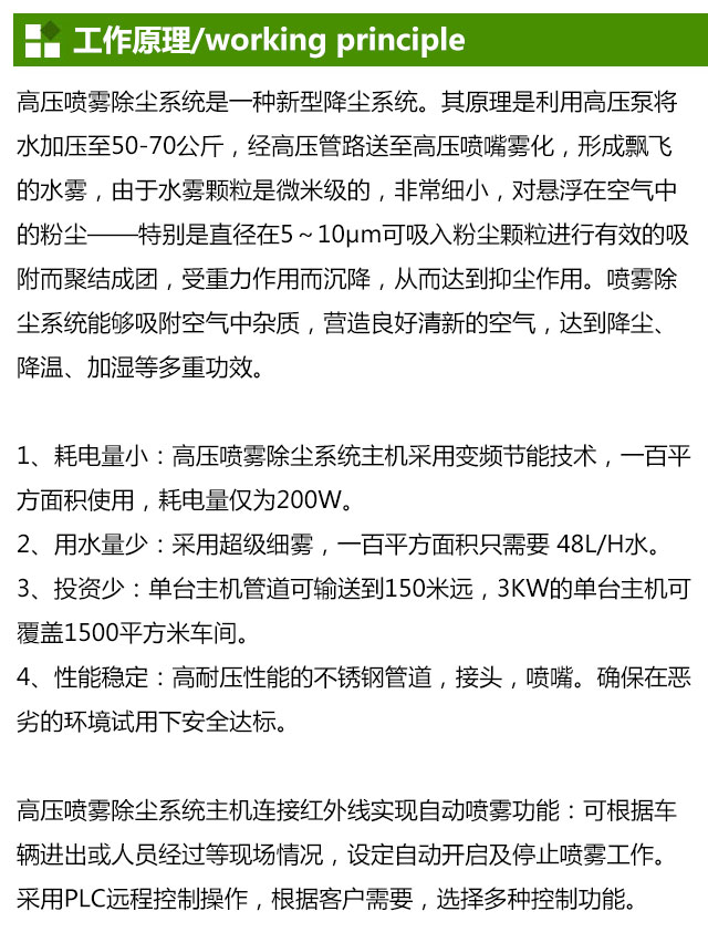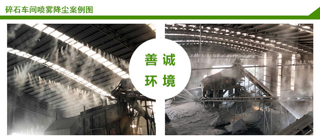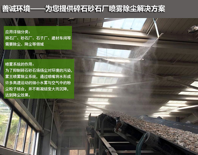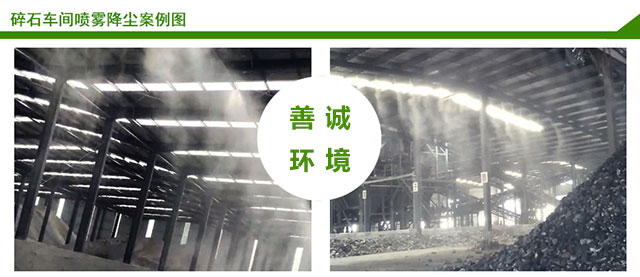 碎石廠噴霧除塵系統采用噴霧嘴將水霧化,利用率高,耗水量少,一次投資后使用成本較低,維護費用低;適用于多種場所除塵:碎石廠、石子廠、建材廠、砂石廠、石料廠、破碎車間等等。