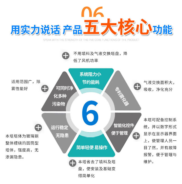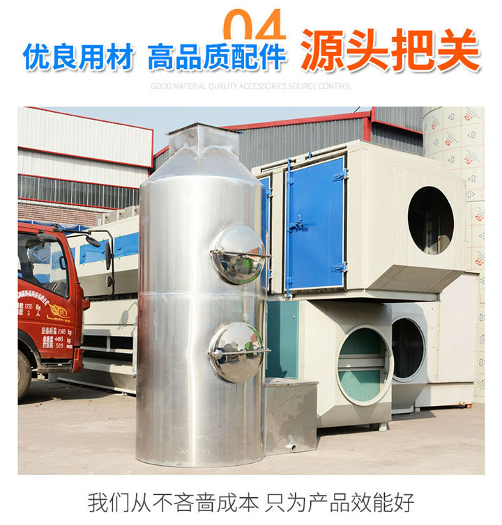不銹鋼噴淋塔內(nèi)部裝有填料層、旋流板、除霧層等,一般采用下進(jìn)風(fēng),上出風(fēng),自下而上處理有機(jī)廢氣,廢氣經(jīng)過(guò)負(fù)壓作用由離心風(fēng)機(jī)抽入不銹鋼噴淋塔內(nèi),與此同時(shí),多重旋流板在風(fēng)機(jī)負(fù)壓作用下開(kāi)始旋轉(zhuǎn),帶動(dòng)旋流板上的有機(jī)藥球與廢氣進(jìn)行充分的接觸,達(dá)到脫硫脫硝的目的,同時(shí),上面的噴淋層不斷的往下均勻噴灑水霧,使有機(jī)廢氣或者顆粒粉塵與水霧進(jìn)行充分接觸,既能達(dá)到去除粉塵的效果,又能起到降溫的功效。帥克環(huán)保zpshuaike點(diǎn)com設(shè)計(jì)的不銹鋼噴淋塔外部設(shè)備循環(huán)管道及循環(huán)水泵,外部設(shè)置水池,因此,顆粒殘?jiān)?jīng)過(guò)重力的作用,沉入水池,在經(jīng)過(guò)人工清理?yè)瞥龊笏梢岳^續(xù)循環(huán)使用,無(wú)需換水,節(jié)約成本,提高效率。