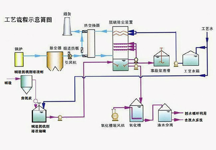 堿渣脫硫方法具有脫硫效率高、吸收劑利用率高、廢水排放少、脫硫塔內(nèi)不易結(jié)垢,達(dá)到“以廢治廢”的特點(diǎn)。
