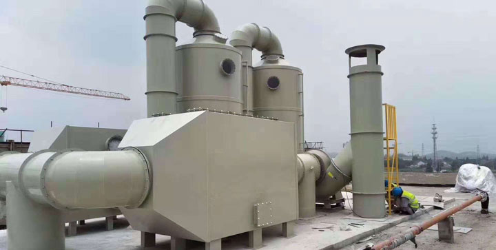 相對于以上兩種形式的碳鋼噴淋塔,塑流式的碳鋼噴淋塔具有多的優勢。杭州善誠環境生產的碳鋼噴淋塔采用的是逆流的方式進行VOCs廢氣的處理凈化。VOCs廢氣在風機的帶動下從底部進入碳鋼噴淋塔內,通過氣流分布格柵均勻地向上運動;液滴由噴嘴噴出由上向下噴淋,噴嘴可以設在一個截面上,也可以分幾層設在幾個截面上。因顆粒和液滴之間的慣性碰撞、攔截和凝聚等作用,使較大的粒子被液滴捕集。凈化后的氣體經過塔上部的除霧擋水板,除去攜帶的水霧達到標準排出。