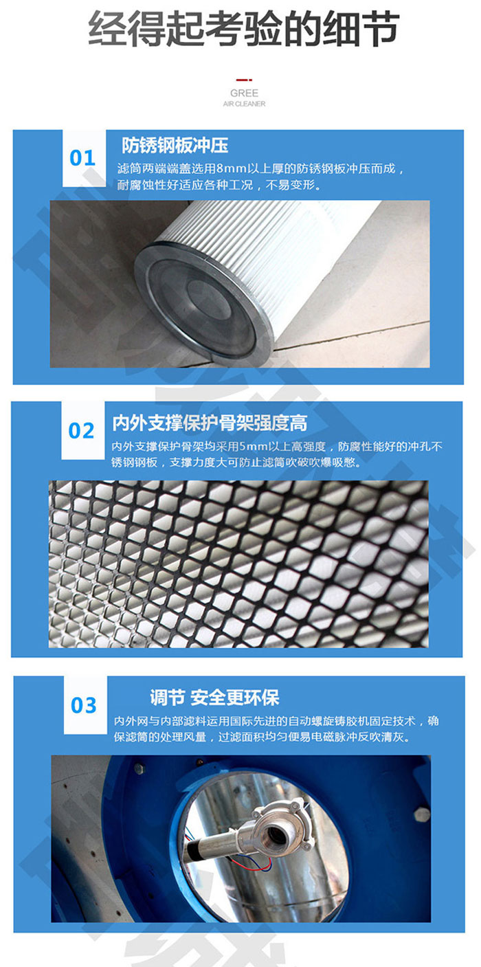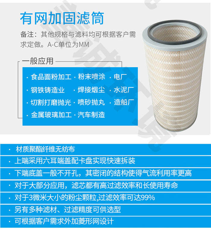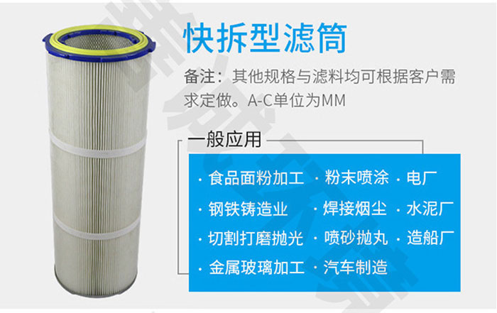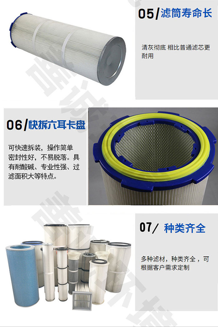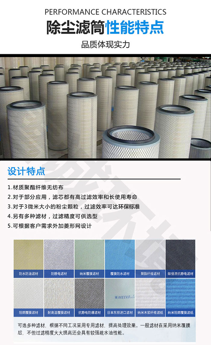 濾筒除塵器以濾筒作為過(guò)濾元件所組成或采用脈沖噴吹的除塵器。 濾筒除塵器按安裝方式分,可以分為斜插式,側(cè)裝式,吊裝式,上裝式。 濾筒除塵器按濾筒材料分,可以分為長(zhǎng)纖維聚酯濾筒除塵器、復(fù)合纖維濾筒除塵器、防靜電濾筒除塵器、阻燃濾筒除塵器、覆膜濾筒除塵器、納米濾筒除塵器等。